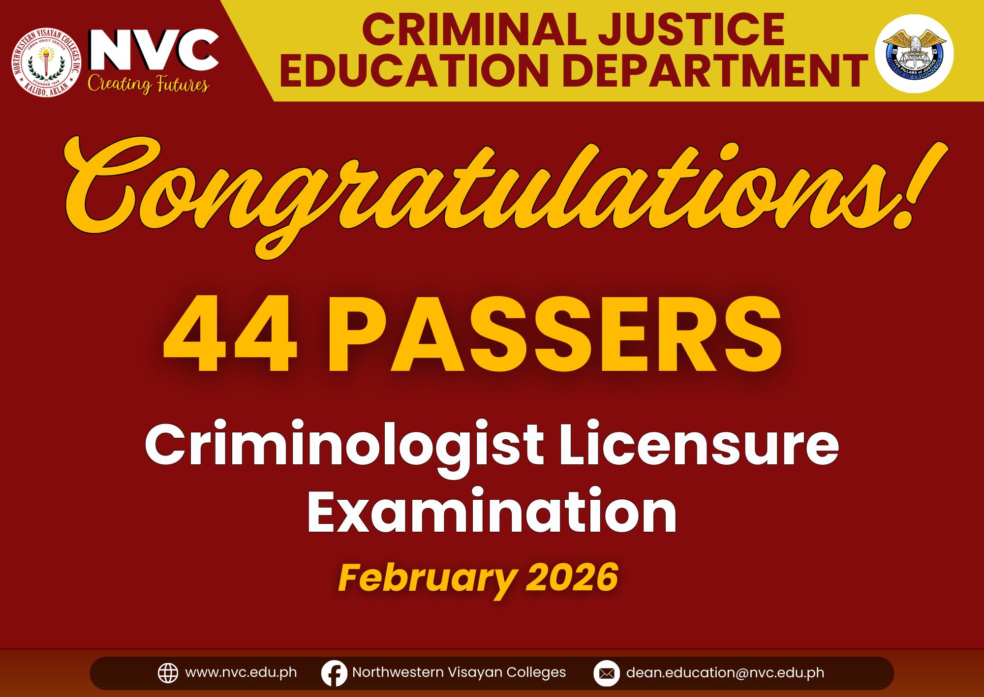 𝗧𝗵𝗲 𝗖𝗼𝗹𝗹𝗲𝗴𝗲 𝗼𝗳 𝗖𝗿𝗶𝗺𝗶𝗻𝗮𝗹 𝗝𝘂𝘀𝘁𝗶𝗰𝗲 𝗘𝗱𝘂𝗰𝗮𝘁𝗶𝗼𝗻 𝗼𝗳 𝗡𝗼𝗿𝘁𝗵𝘄𝗲𝘀𝘁𝗲𝗿𝗻 𝗩𝗶𝘀𝗮𝘆𝗮𝗻 𝗖𝗼𝗹𝗹𝗲𝗴𝗲𝘀 (𝗡𝗩𝗖) 𝗽𝗿𝗼𝘂𝗱𝗹𝘆 𝗰𝗲𝗹𝗲𝗯𝗿𝗮𝘁𝗲𝘀 𝘁𝗵𝗲 𝘀𝘂𝗰𝗰𝗲𝘀𝘀 𝗼𝗳 𝗼𝘂𝗿 𝟰𝟰 𝗽𝗮𝘀𝘀𝗲𝗿𝘀 𝗶𝗻 𝘁𝗵𝗲 𝗙𝗲𝗯𝗿𝘂𝗮𝗿𝘆 𝟮𝟬𝟮𝟲 𝗖𝗿𝗶𝗺𝗶𝗻𝗼𝗹𝗼𝗴𝗶𝘀𝘁 𝗟𝗶𝗰𝗲𝗻𝘀𝘂𝗿𝗲 𝗘𝘅𝗮𝗺𝗶𝗻𝗮𝘁𝗶𝗼𝗻!